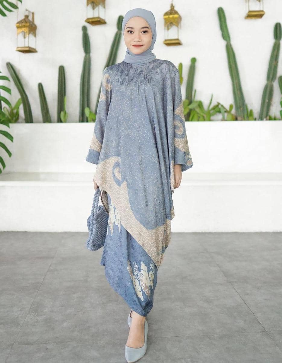 Kembali menggunakan bahan viscose, model baju tunik ini dijahit dengan model kelelawar. Model ini memiliki detail lengan yang lebar dan badan yang lebar. Maka dari itu, bawahan yang cocok untuk mengimbanginya adalah rok lilit motif yang sewarna. Meskipun bermotif, rok ini tetap memberi kesan elegan karena hanya satu warna saja.